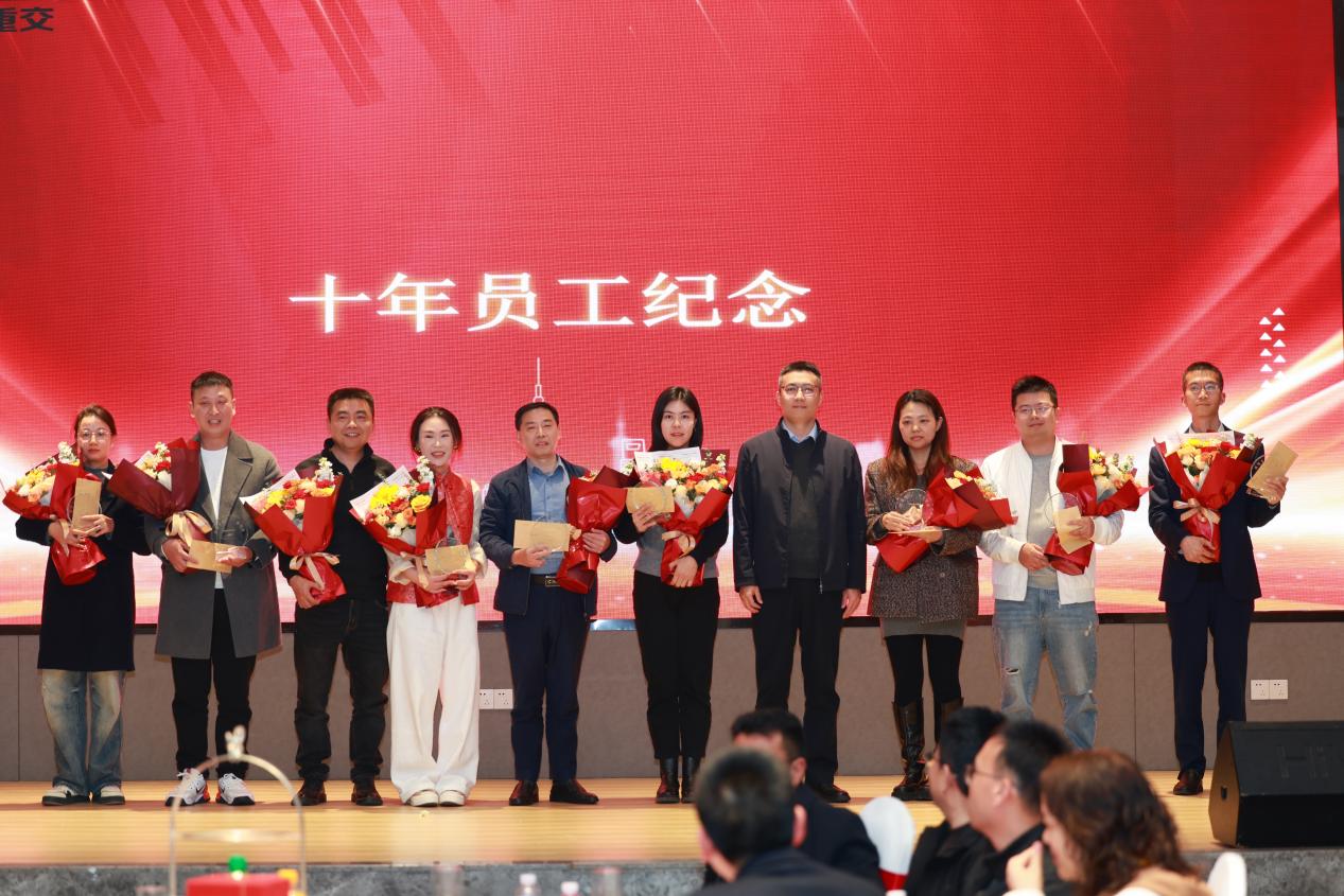 年會特別設(shè)置十年員工致敬環(huán)節(jié),劉宗啟等9位堅守公司十年的員工獲頒榮譽,重慶重交董事長韓曉虎為他們逐一頒獎,感謝其以青春與堅守陪伴公司成長。
