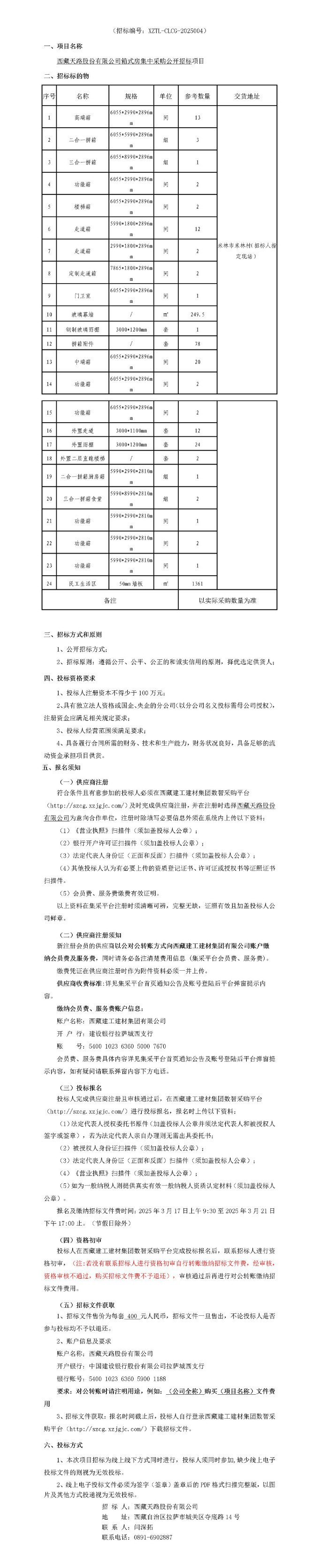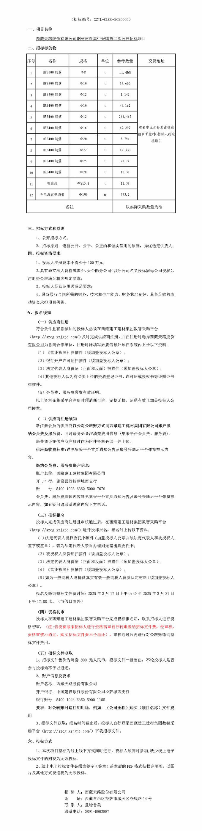 點擊量:7295(招標編號:XZTL-CLCG-2025006) 一、項目名稱 西藏天路股份有限公司鋼筋材料集中采購公開招標項目 二、招標標的物 序號 名稱 規(guī)格 單位 參考數(shù)量 交貨地址 1 鋼筋HRB400E Φ6 T 2 西藏自治區(qū) 那曲市市內(nèi) 2 鋼筋HRB400E Φ8 T 4 3 鋼筋HRB400E Φ10 T 3 4 鋼筋HRB400E Φ12 T 12 5 鋼筋HRB400E Φ14 T 12 6 鋼筋HRB400E Φ16 T 12 7 鋼筋HRB400E Φ18 T 12 8 圓鋼HPB300 Φ8 T 240 合計 297 備注 以實際采購數(shù)量為準 三、招標方式和原則 1、公開招標方式; 2、招標原則:遵循公開、公平、公正的和誠實信用的原則,擇優(yōu)選定供貨人; 四、投標資格要求 1、投標人注冊資本不得少于100萬元; 2、具有獨立法人資格或國企、央企的分公司(以分公司名義投標需母公司授權(quán)),注冊資金應(yīng)滿足相關(guān)規(guī)定要求; 3、投標人經(jīng)營范圍須滿足要求; 4、具備履行合同所需的財務(wù)、技術(shù)和生產(chǎn)能力,財務(wù)狀況良好,具備足夠的流動資金承擔項目供貨。 五、報名須知 (一)供應(yīng)商注冊(已注冊成功的可直接登錄平臺投標報名) 符合條件且有意參加的投標人必須在西藏建工建材集團數(shù)智采購平臺(http://szcg.xzjgjc.com/)及時完成供應(yīng)商注冊,并在注冊時選擇西藏天路股份有限公司為意向合作單位,注冊時除填寫必要信息外須在系統(tǒng)內(nèi)上傳以下資料: (1)《營業(yè)執(zhí)照》掃描件(須加蓋投標人公章); (2)銀行開戶許可證掃描件(須加蓋投標人公章); (3)法定代表人身份證(正面和反面)掃描件(須加蓋投標人公章); (4)其他投標人認為有必要上傳的資質(zhì)登記證書、許可證或授權(quán)書等證照證書掃描件。 以上資料在集采平臺注冊時須清晰可辨,完整無缺,證照有效且加蓋投標人公司鮮章。 (二)供應(yīng)商注冊須知 愿意加入西藏建工建材集團數(shù)智采購平臺供應(yīng)商庫并且有意愿投標的的企業(yè),需繳納平臺會員費及服務(wù)費,各供應(yīng)商繳費時務(wù)必備注清楚繳費信息 (集采平臺會員費、服務(wù)費)與繳費單位信息,注冊時在相應(yīng)位置上傳繳費憑證以及相應(yīng)資審文件成為新供應(yīng)商。 供應(yīng)商入駐平臺收費標準及繳費賬戶信息:具體內(nèi)容詳見集采平臺首頁通知公告及平臺彈窗提示。 賬戶名稱:西藏建工建材集團有限公司 開 戶 行:建設(shè)銀行拉薩城西支行 賬 號:5400 1023 6360 5000 7670 (三)投標報名 投標人完成供應(yīng)商注冊且審核通過后,在西藏建工建材集團數(shù)智采購平臺(http://szcg.xzjgjc.com/)進行投標報名,報名時上傳以下資料: (1)法定代表人授權(quán)委托書原件(加蓋投標人公章并須法定代表人和被授權(quán)人簽字或簽章),若為法定代表人親自辦理則無需出具委托書; (2)被授權(quán)人身份證掃描件(須加蓋投標人公章); (3)法定代表人身份證(正面和反面)掃描件(須加蓋投標人公章); (4)《營業(yè)執(zhí)照》掃描件(須加蓋投標人公章); (5)如為一般納稅人則提供真實有效一般納稅人資質(zhì)認定材料(須加蓋投標人公章)。 報名及繳納招標文件費時間:2025年3月28日上午9:30至2025年4月3日下午17:30止。(節(jié)假日除外) (四)資格初審 投標人在西藏建工建材集團數(shù)智采購平臺完成投標報名后,聯(lián)系招標人進行資格初審,(注:若沒有聯(lián)系招標人進行資格初審自行轉(zhuǎn)賬繳納招標文件費,經(jīng)審核,資格審核不通過,購買招標文件費不予退還),審核通過后再進行對公轉(zhuǎn)賬繳納招標文件費用。 (五)招標文件獲取 招標文件售價為每套 400 元人民幣,招標文件一旦售出,不論投標人是否參與投標均不予以退還。 賬戶信息及要求 賬戶名稱;西藏天路股份有限公司 開戶銀行:中國建設(shè)銀行股份有限公司拉薩城西支行 銀行賬號:54001023636059001188 要求:對公轉(zhuǎn)賬時請注明用途,例如:(公司全稱)購買(項目名稱)文件費用 3、招標文件獲?。簣竺麜r間截止后,投標人自行登錄西藏建工建材集團數(shù)智采購平臺(http://szcg.xzjgjc.com/)下載招標文件。 六、投標方式 1、本次項目招標為線上線下方式同時進行,投標人須同時參加,缺少線上電子投標文件的則視為無效投標。 2、線上電子投標文件必須為簽字蓋章后的PDF格式掃描完整版,以圖片及其他方式投遞視為無效投標。 招 標 人:西藏天路股份有限公司 地 址:西藏自治區(qū)拉薩市城關(guān)區(qū)奪底路14號 聯(lián) 系 人:成 鳳 聯(lián)系電話:0891-6902887