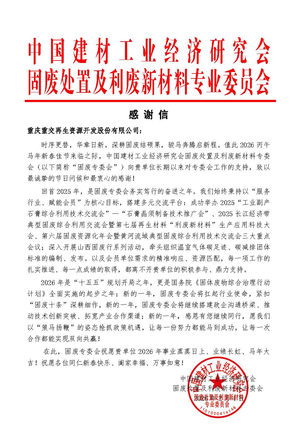 點(diǎn)擊量:215近日,中國(guó)建材工業(yè)經(jīng)濟(jì)研究會(huì)固廢處置及利廢新材料專業(yè)委員會(huì)向重慶重交再生資源開(kāi)發(fā)股份有限公司發(fā)來(lái)感謝信,對(duì)重慶重交在2025年對(duì)固廢專委會(huì)各項(xiàng)工作的大力支持表示衷心感謝,同時(shí)高度贊譽(yù)重慶重交在固廢資源化與利廢新材料領(lǐng)域的技術(shù)創(chuàng)新成果與產(chǎn)業(yè)貢獻(xiàn)。 感謝信中指出,2025年是固廢專委會(huì)務(wù)實(shí)奮進(jìn)的一年,各項(xiàng)工作穩(wěn)步推進(jìn)、成果顯著。重慶重交積極參與固廢專委會(huì)組織的多項(xiàng)重點(diǎn)行業(yè)會(huì)議、技術(shù)交流與標(biāo)準(zhǔn)編制工作,